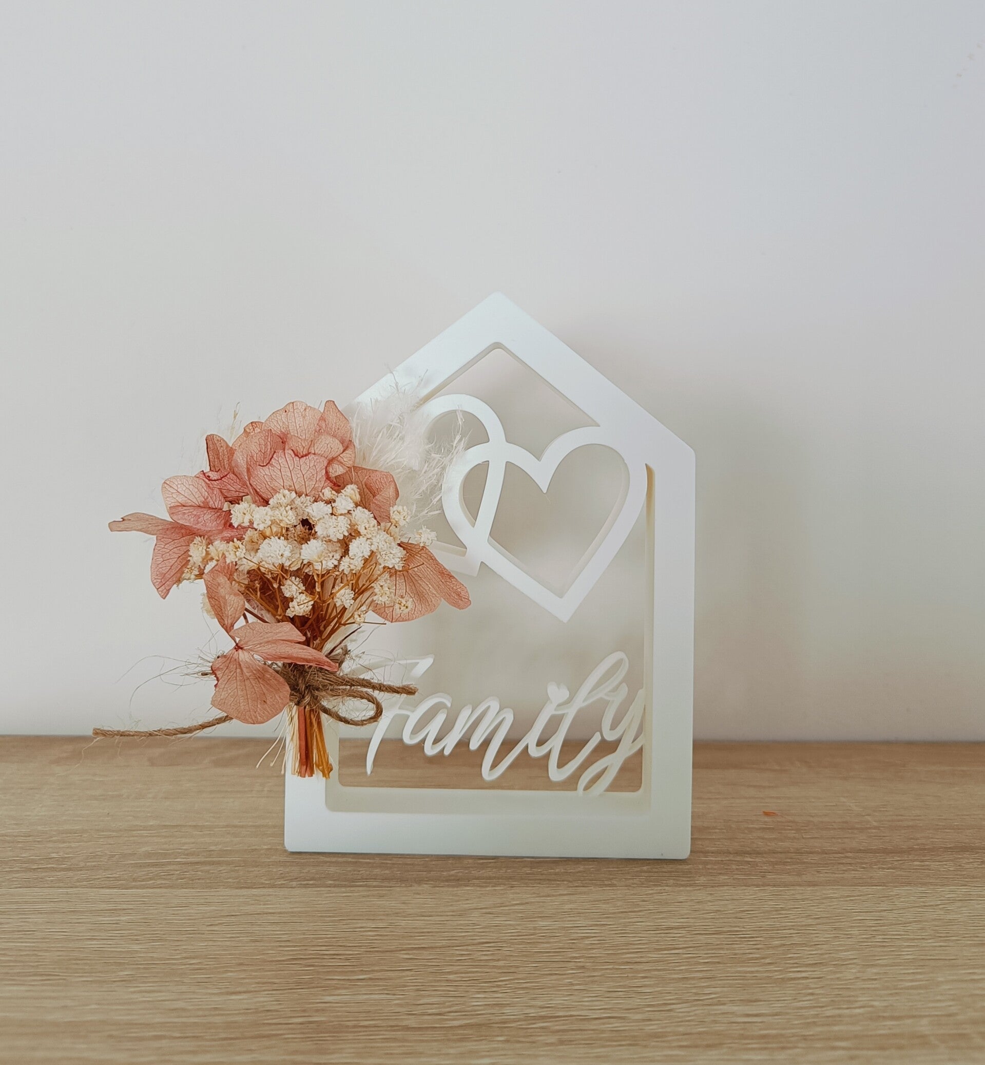 Huisje met 2 hartjes en opschrift 'family'. Wij fleurde' dit stukje op met droogbloemen.