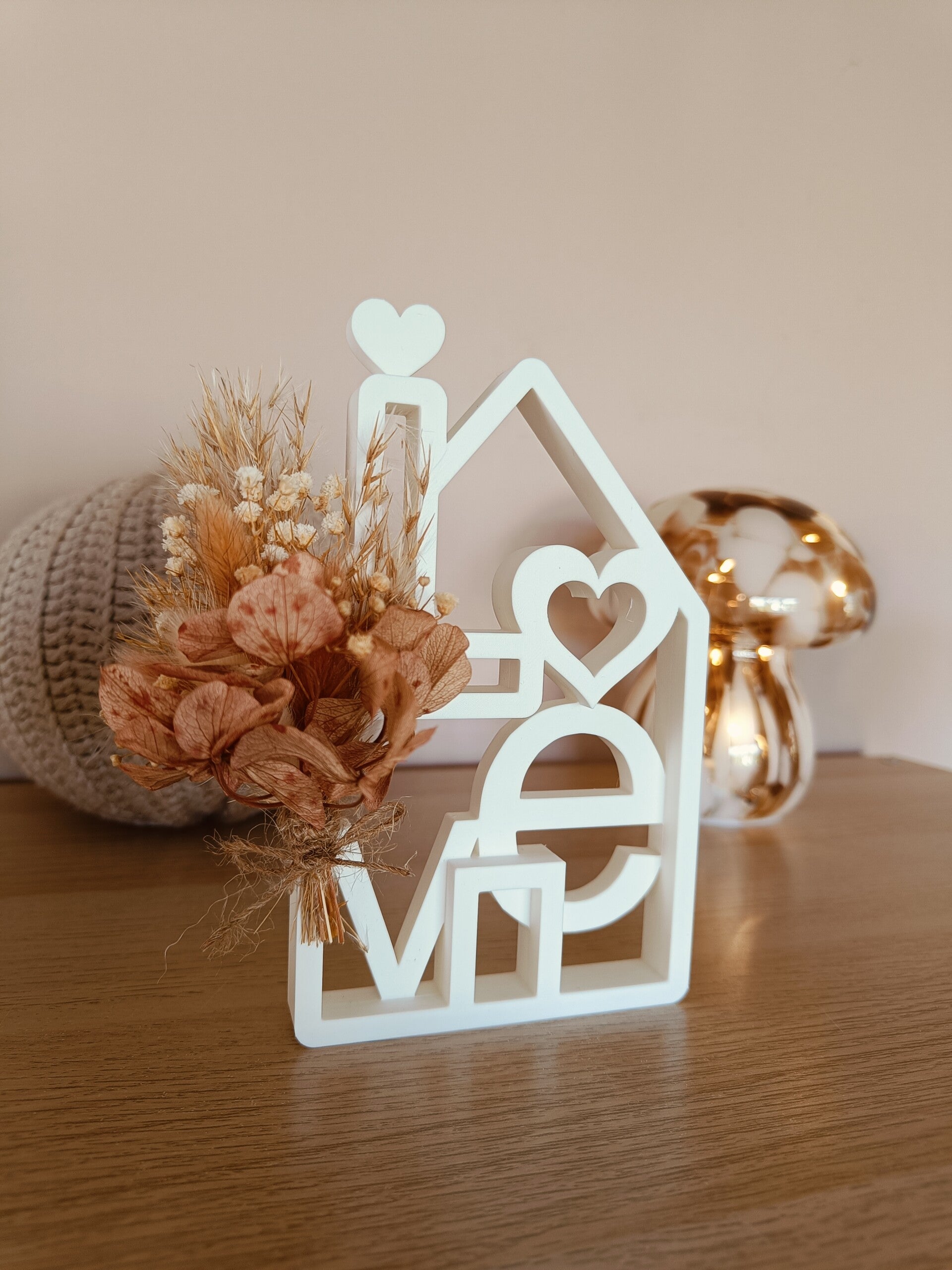Schattig huisje met opschrift 'love' afgewerkt met droogbloemen in warme tinten.