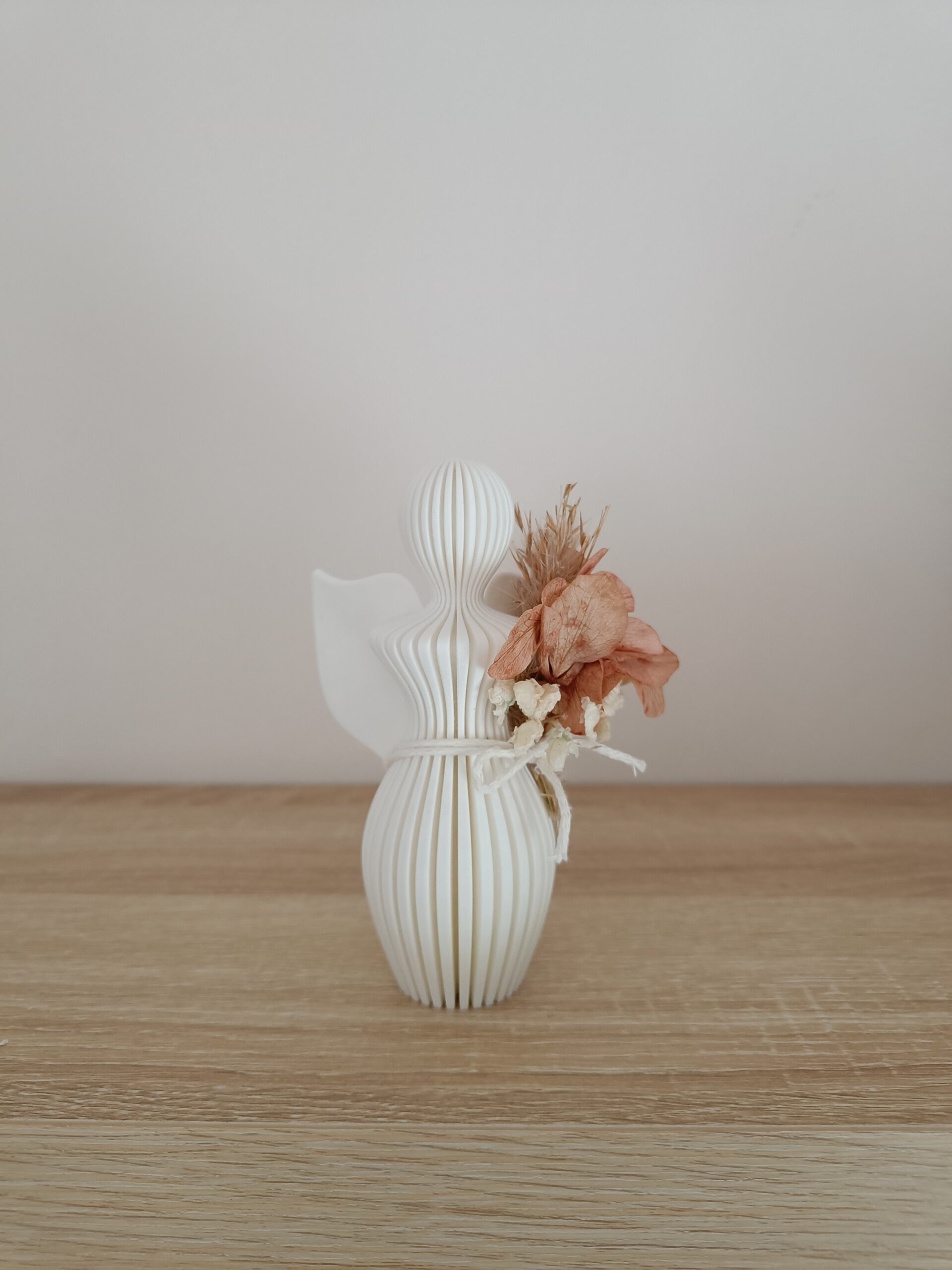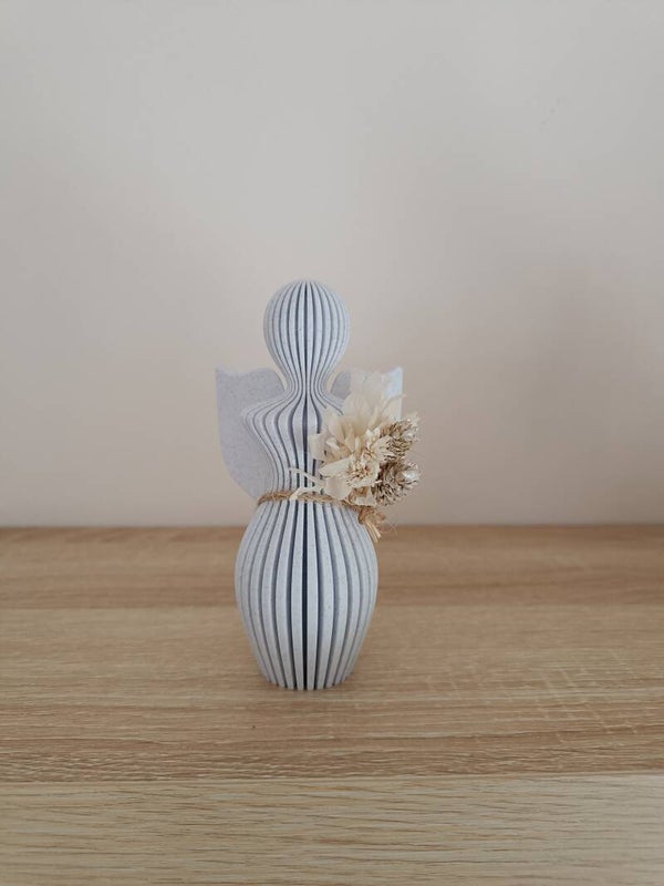 Moderne engel afgewerkt met droogbloemen. Opgelet niet geschikt voor buiten, maar wel heel mooi om bij bvb bij een foto van een geliefde te zetten.
