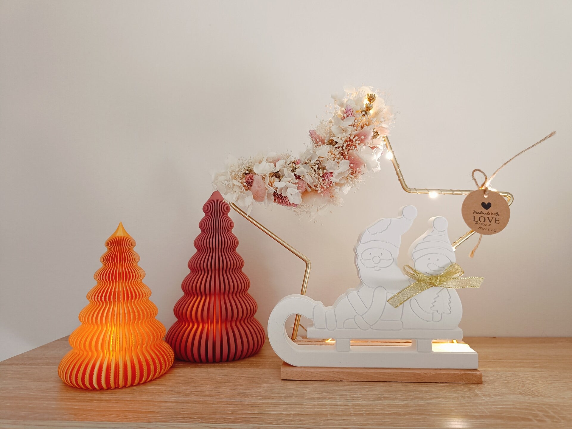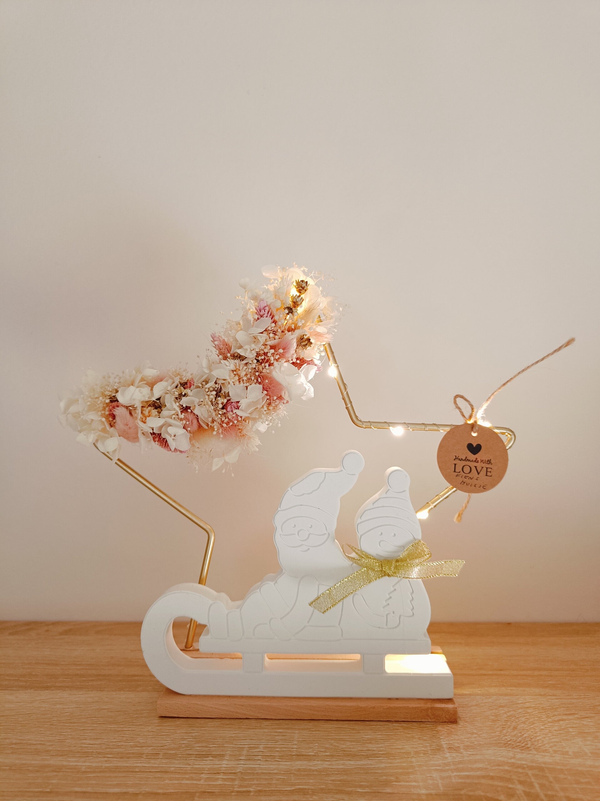 Gouden ster met droogbloemen in tint roze, wit en goud. De ster is ook voorzien van lichtjes. De witte slee is door ons gegoten uit porseleingips.
