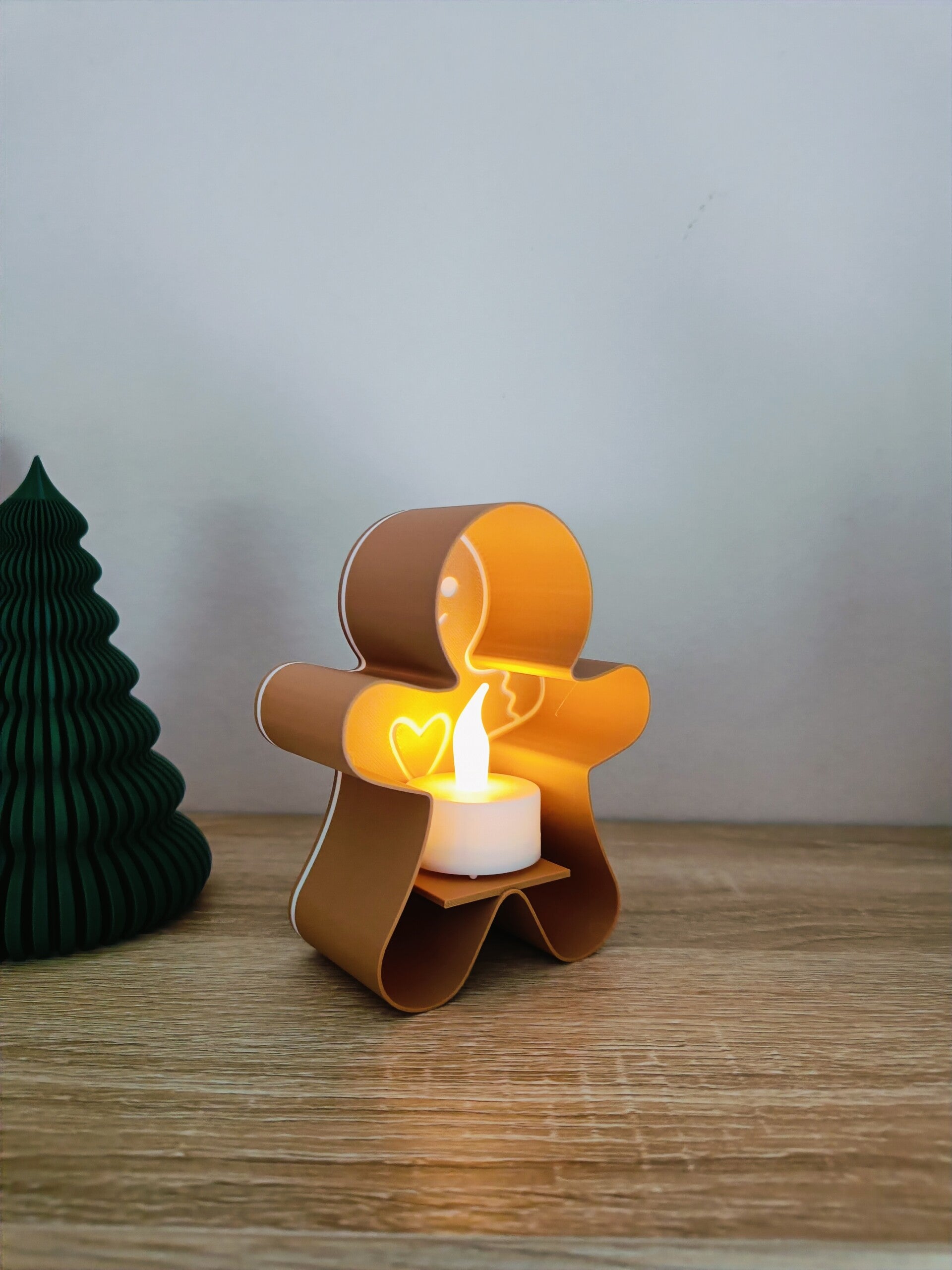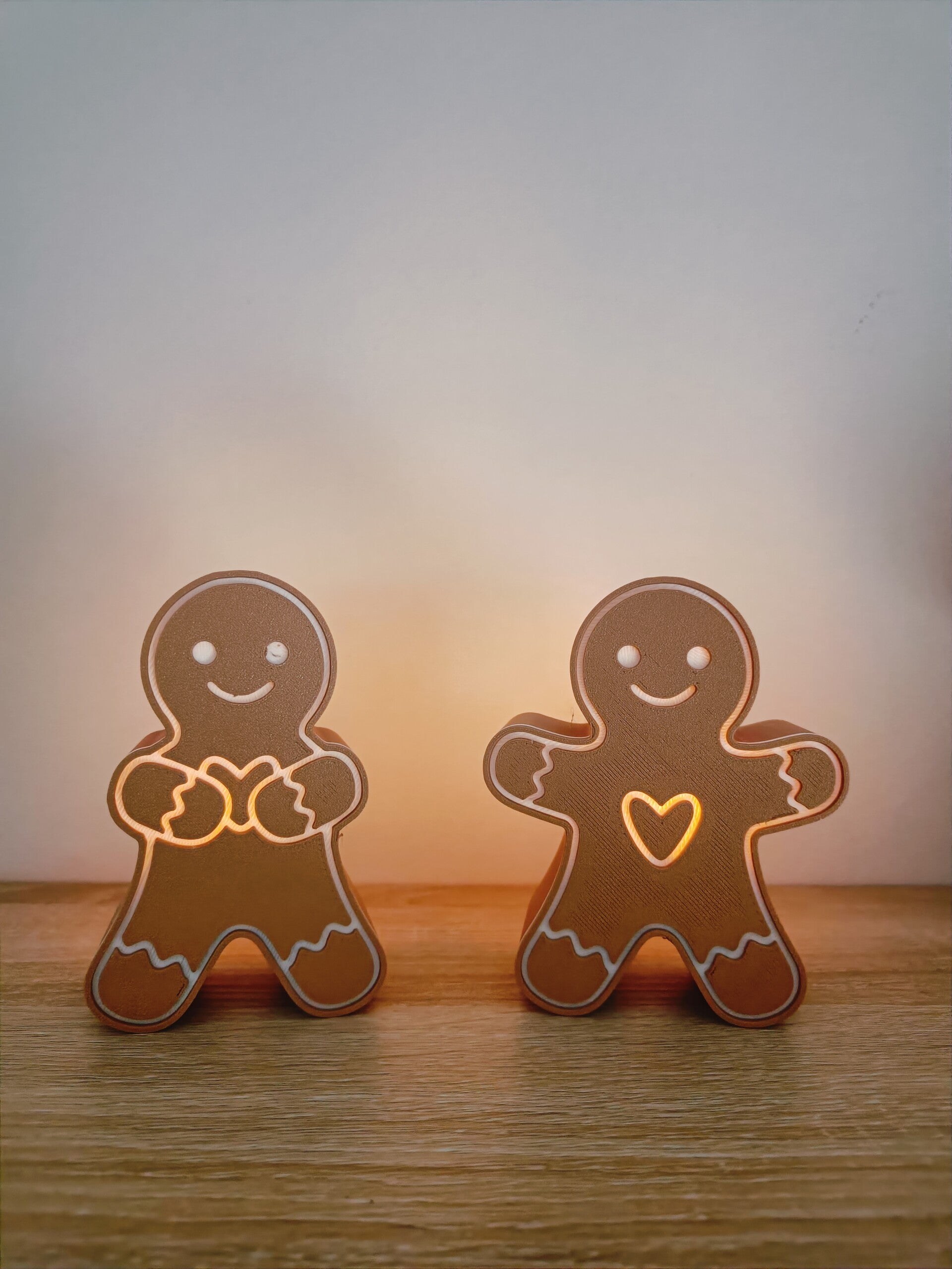 Peperkoeken mannetjes met geopende oogjes. Achteraan kan er een theelichtje op batterijen in geplaatst worden.