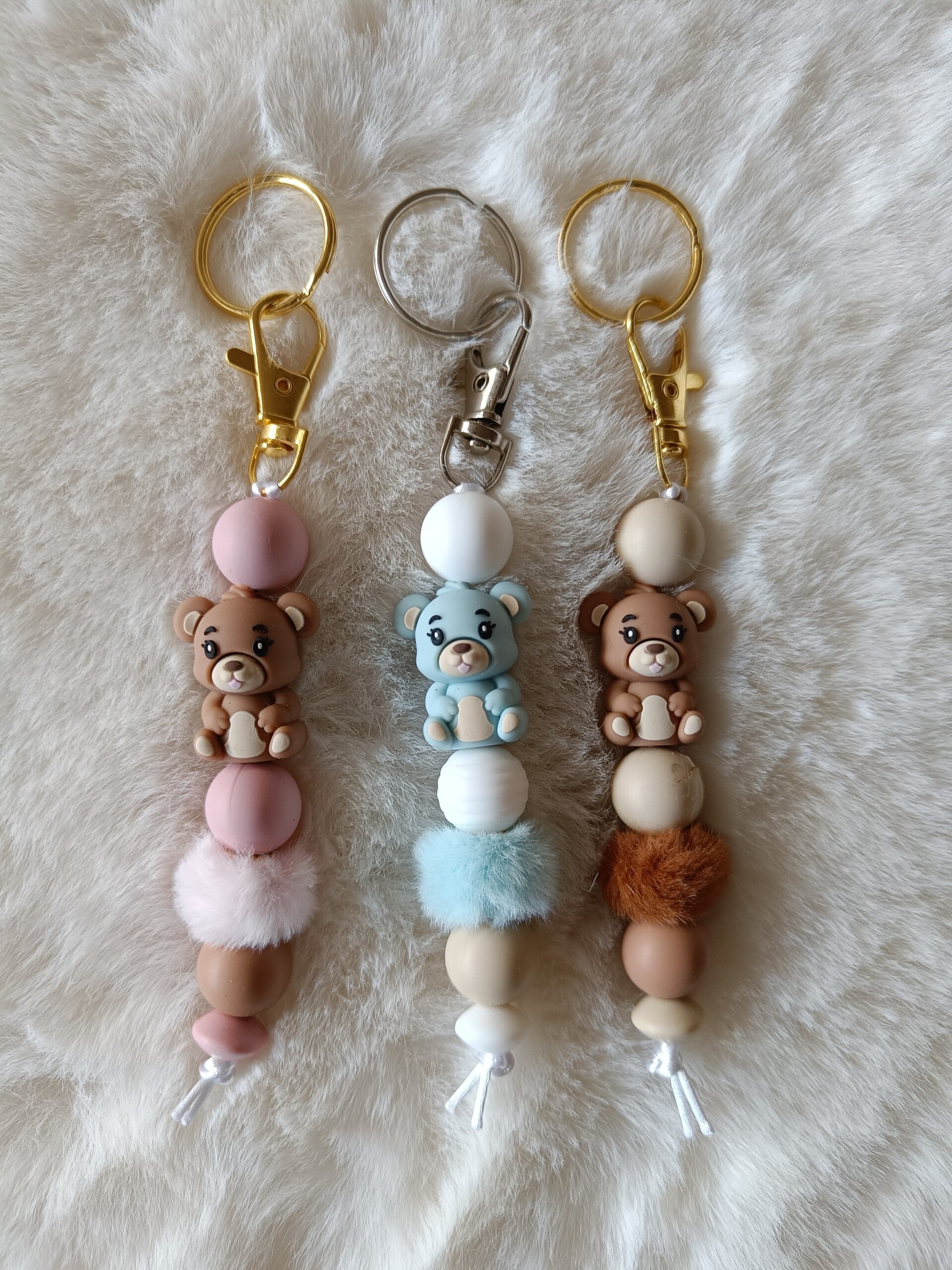 Sleutelhanger met een schattig beertje en bijpassende siliconen kralen in warme kleuren.