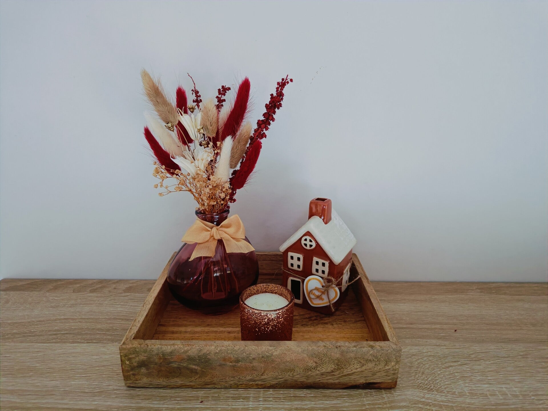 Houten plateau met bordeaux en crèmekleurige tinten.