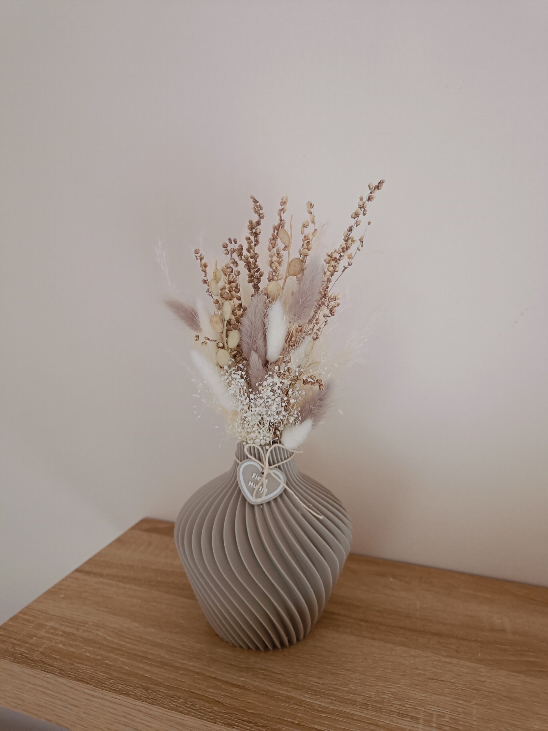Unieke vaas 15 cm hoog, gevuld met droogbloemen in bijpassende tinten. Deze vaas komt er nog aan in 11 cm hoog en in andere kleuren.