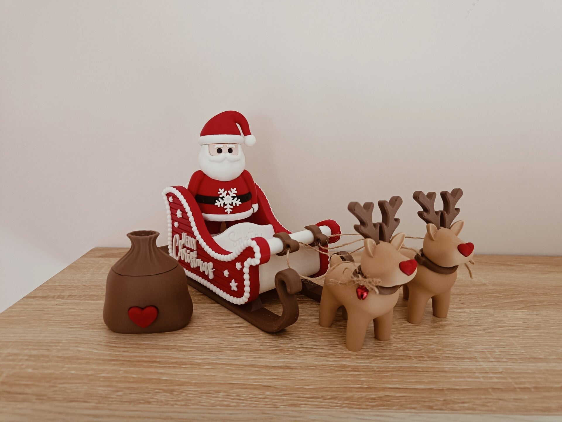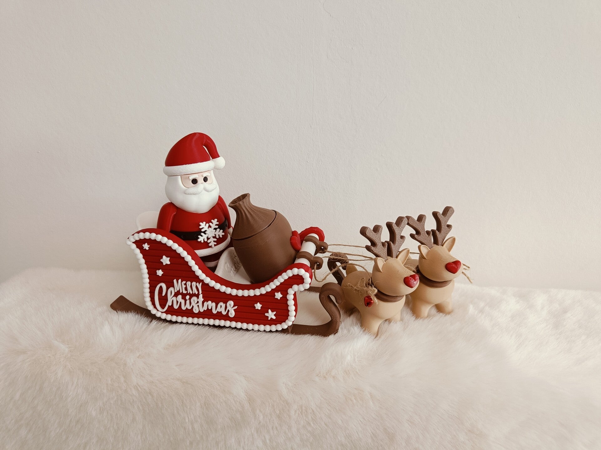 Prachtige 3D slee met 2 rendiertjes met belletjes aan de hals. De slee is afgewerkt vol leuke details. Santa apart verkrijgbaar.