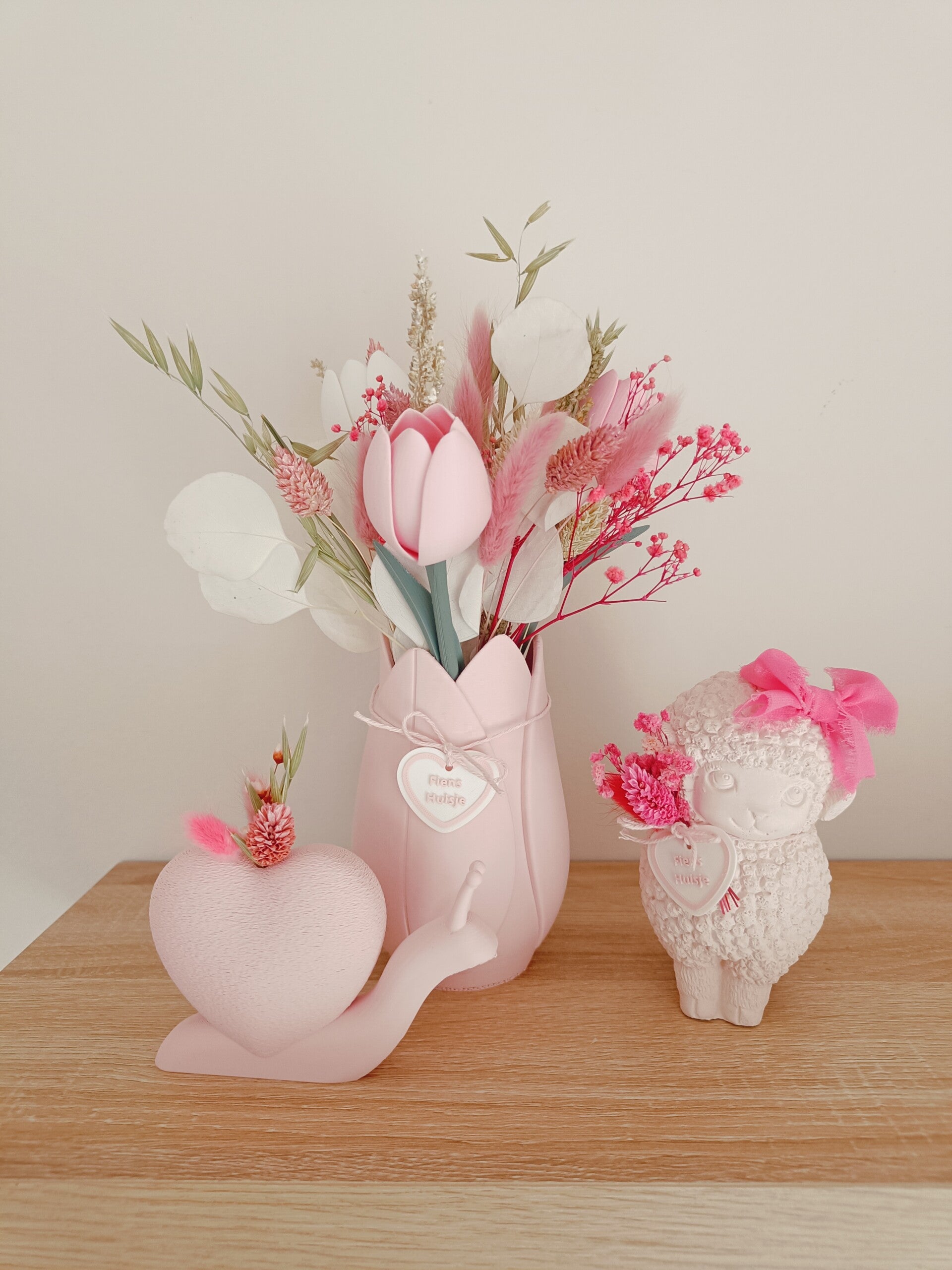 Roze 3D tulpenvaas met 3 tulpjes ook door ons 3D geprint.
