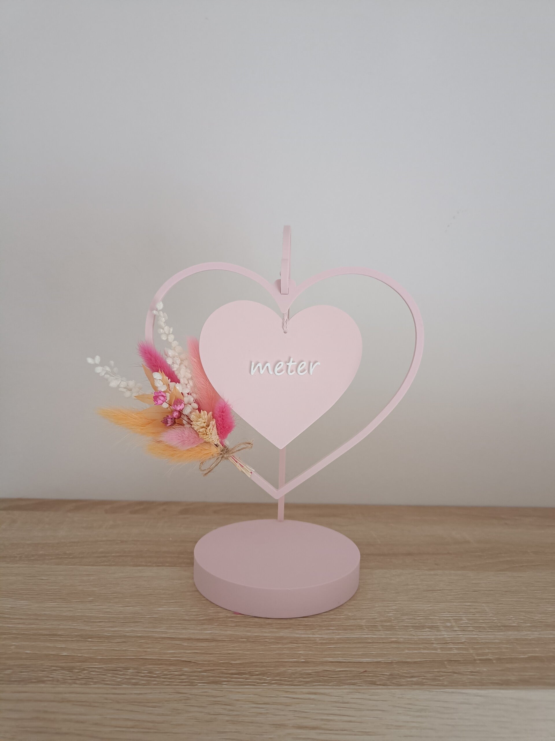 3D staandertje met hangend hartje met opschrift 'meter'.
