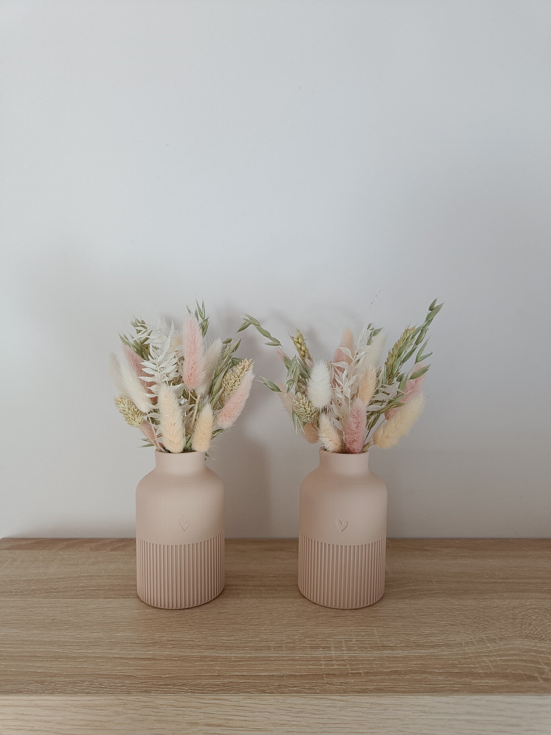 Mooi vaasje in de kleur beige met subtiel hartje vooraan en gevuld met droogbloemen zoals op de foto's.